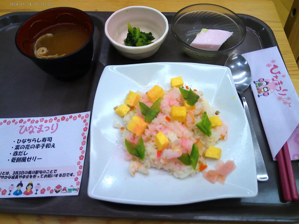 介護の家でも先月より七段飾りのひな人形が飾られ、今日は「ひなチラシ寿司」を召し上がり、皆様でお祝いをしました。